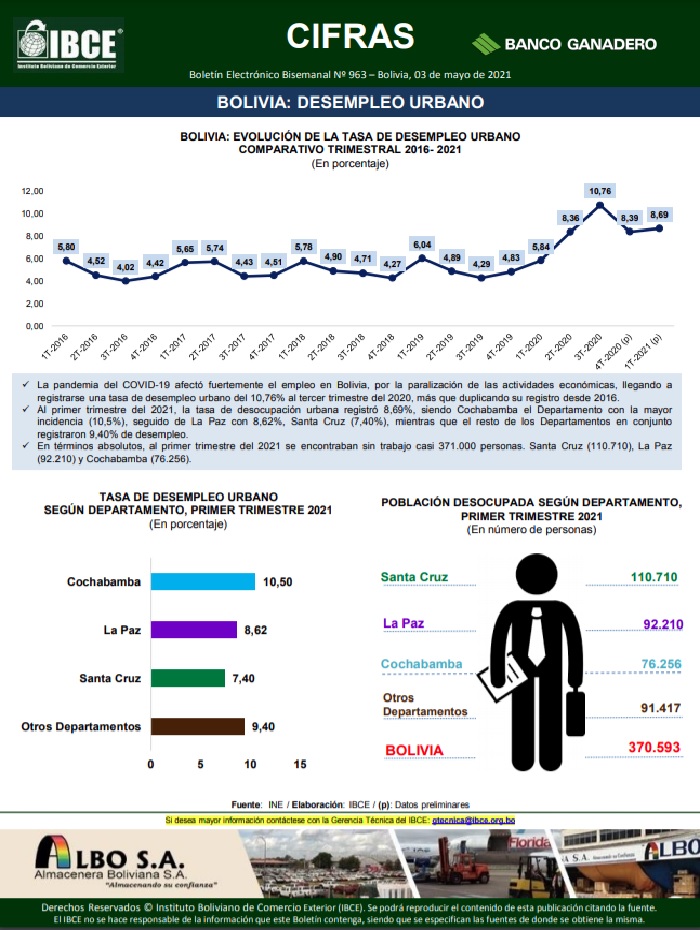 La pandemia del COVID-19 afectó fuertemente el empleo en Bolivia, por la paralización de las actividades económicas, llegando a registrarse una tasa de desempleo urbano del 10,76% al tercer trimestre del 2020, más que duplicando su registro desde 2016. Al primer trimestre del 2021, la tasa de desocupación urbana registró 8,69%, siendo Cochabamba el Departamento con la mayor incidencia (10,5%), seguido de La Paz...ver más