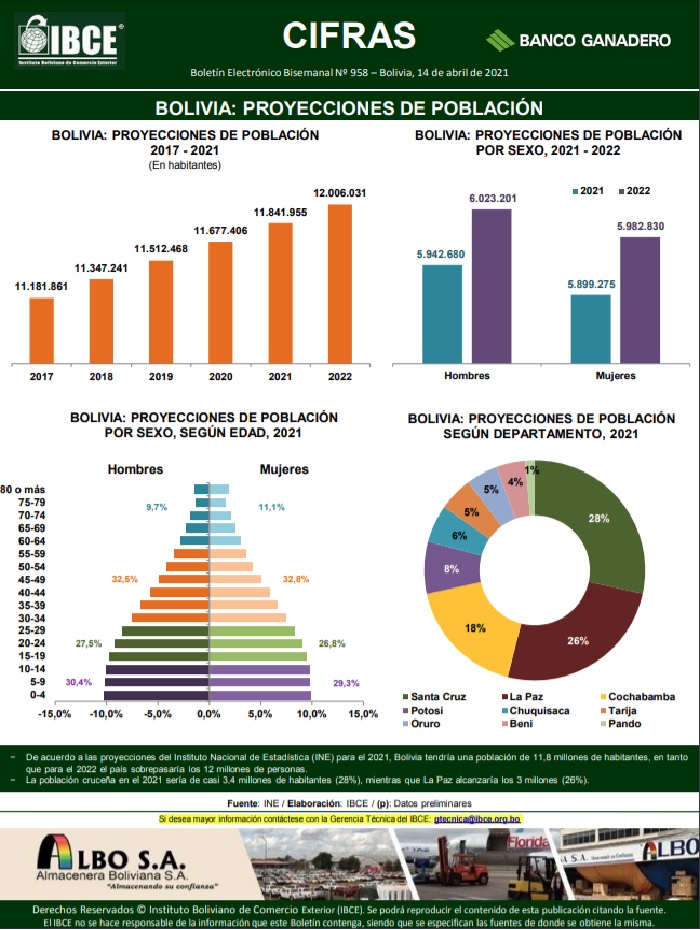 De acuerdo a las proyecciones del Instituto Nacional de Estadística (INE) para el 2021, Bolivia tendría una población de 11,8 millones de habitantes, en tanto que para el 2022 el país sobrepasaría los 12 millones de personas. La población cruceña en el 2021 sería de casi 3,4 millones de habitantes (28%), mientras que La Paz alcanzaría los 3 millones (26%).
